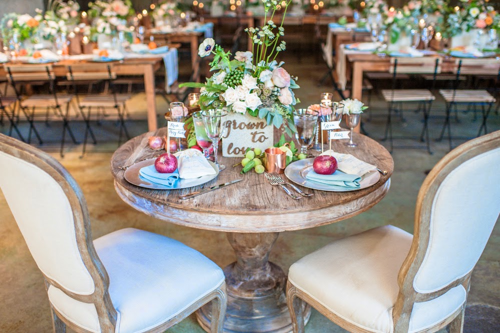 Looking back on this wedding has us longing for Paris and fresh flowers in our bicycle basket! When we first met Mary Beth + Peter we learned among many other things about their love for frequenting their local farmers market. This inspired us to to pair a subtle industrial feel with their favorite weekend pastime into the decor! We sent guests "To Market" to find their table assignments from a produce filled escort display we created (after nearly buying out all of whole foods!) and named tables after the couple's favorite fruits and veggies! We teamed up with Peanut Press and Pitbulls & Posies to deliver the prettiest of paper and favors were muslin bags filled with our couples favorite gathered farmers market items to give them a sampling of San Diego. We loved playing with the juxtaposition of the soft florals by Twigg Botanicals mixed with concrete cinder blocks and had a ton of fun DIY-ing the wooden candle holders that were placed at each table.